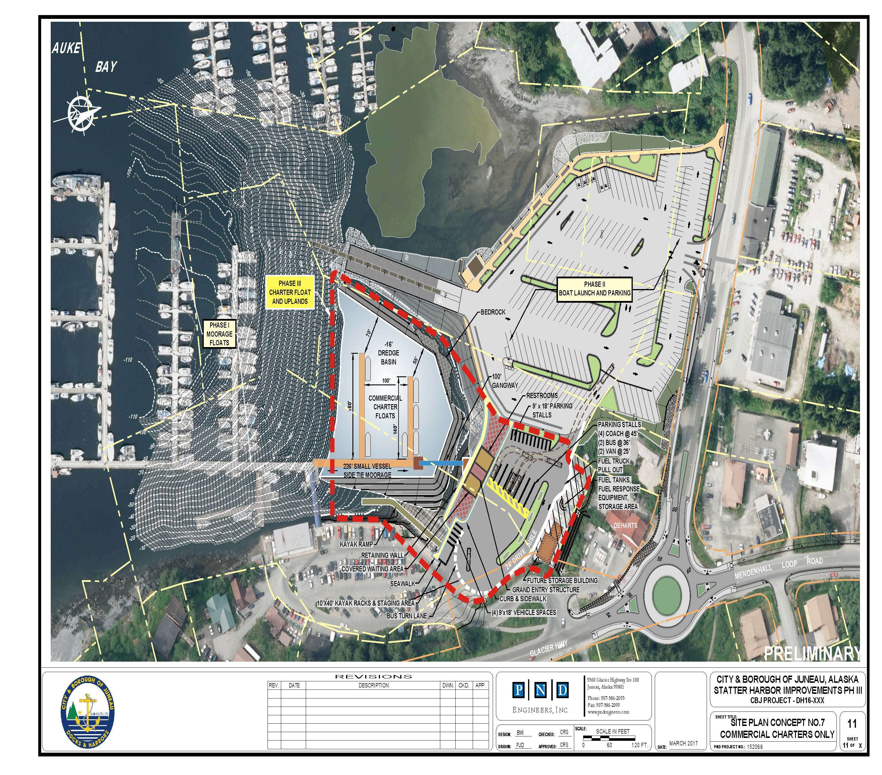 The Statter Harbor Improvements Project, Phase III(B) or SHI III(B) for short is the second in 3 winter work phases to add additional tour vessel moorage and uplands transportation improvements to Statter Harbor. SHI III(B) focuses on installing new floats, utilities, a second gangway and a concrete block wall to add 850 lf of new moorage for tour operators. The expansion of Statter Harbor will help increase moorage space for all users of the harbor.