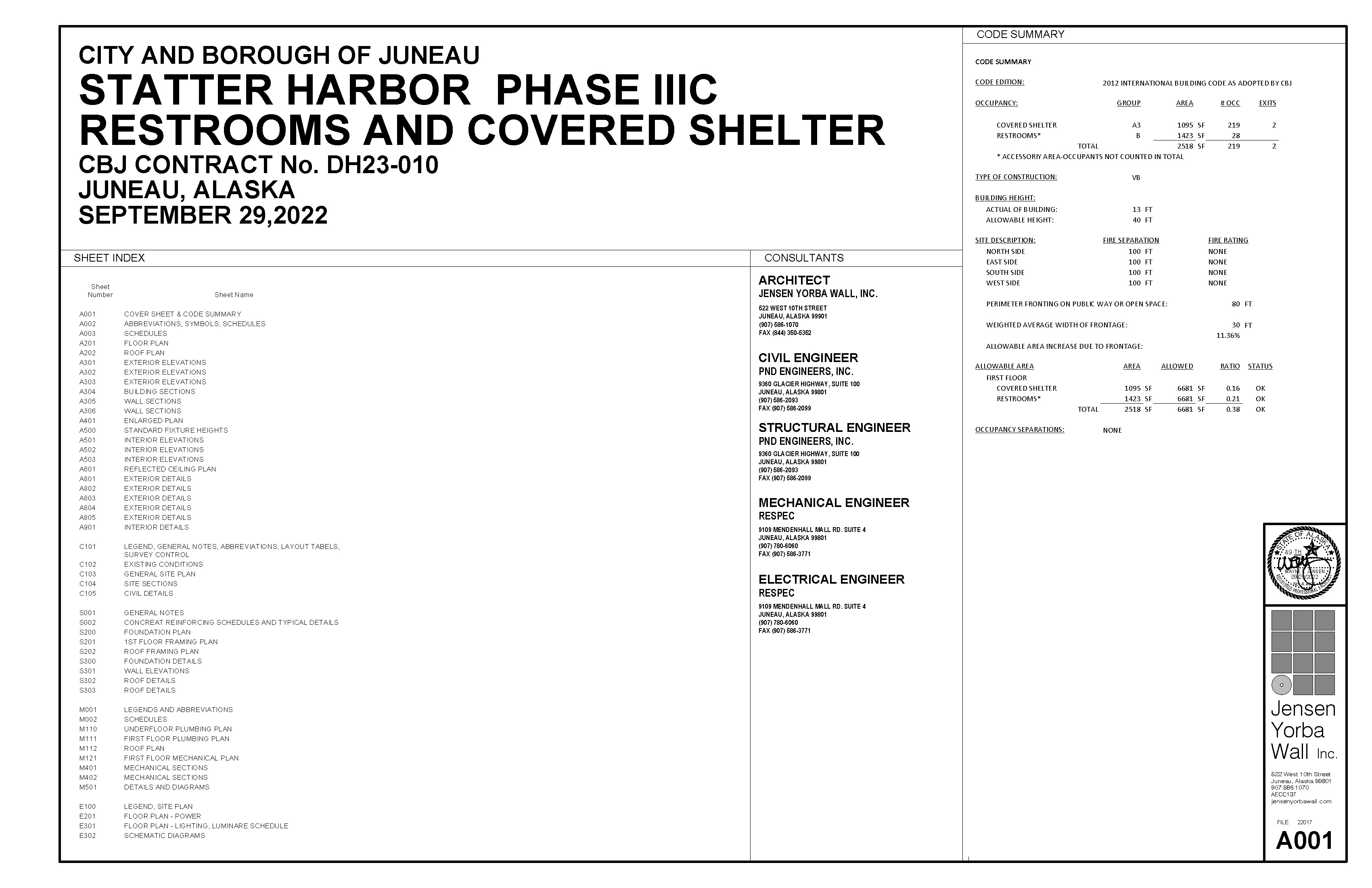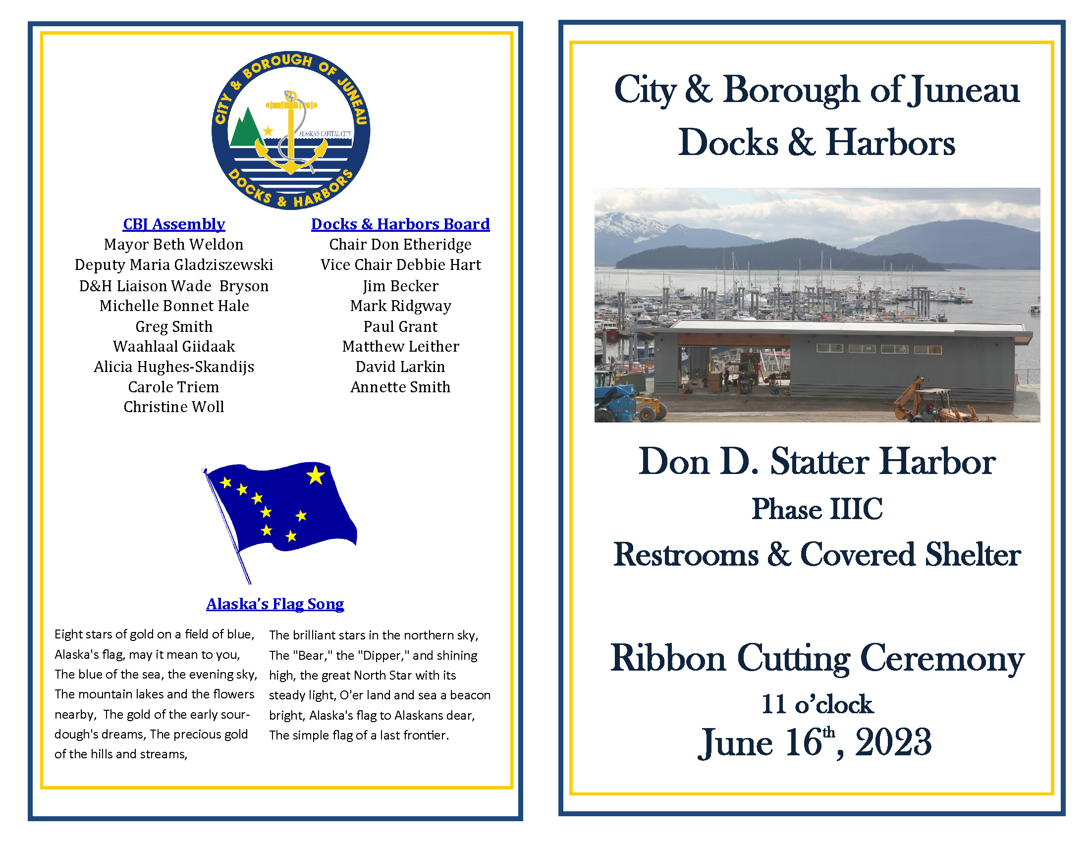 The WORK generally consists of the construction of a restroom building with an attached covered waiting area to provide restroom facilities for the passenger-for-hire floats at Don D. Statter Harbor. The building has cast concrete foundations, timber framing, metal siding, tongue and groove roof decking and a membrane roof. Utilities included in the Project include potable water, sewer, and electrical. The building will be partially heated and will include both interior and exterior lights and security cameras.
