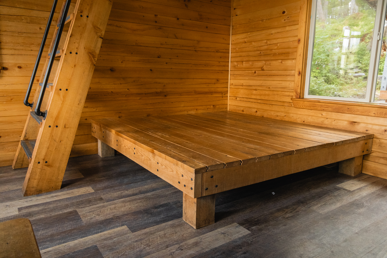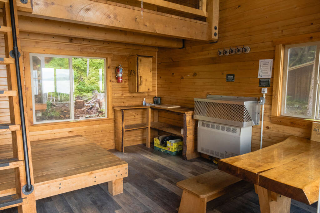 This 14×16-ft. Icy Straits Lumber cabin sleeps up to eight people with a sleeping loft (accessible by ladder) and a 7’ x 7’ wooden sleeping platform on the first floor. The cabin also has a propane heater, table, benches, broom and dustpan. Propane for the heater is provided. A vault toilet (outhouse) is nearby, as well as a fire pit. The cabin is accessible with a ramp. Water and electricity are not available.